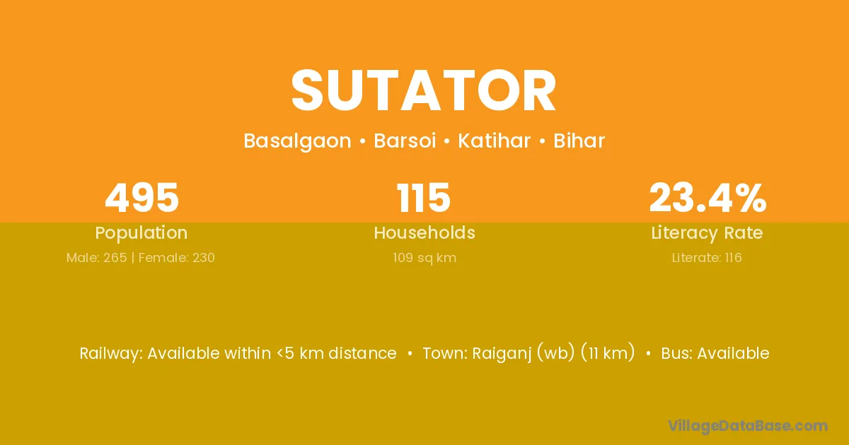 Sutator village has a total population of 495 people, of which 265 are males and 230 are females.