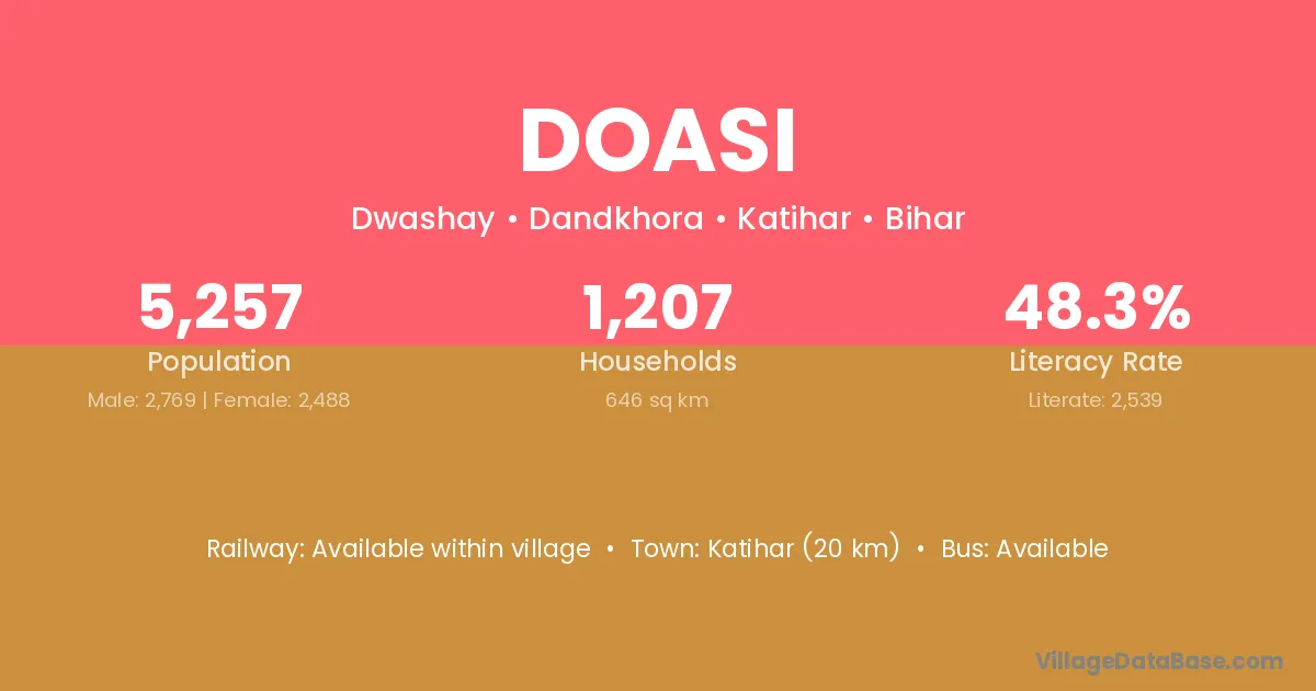 Katihar (20 km) is the nearest town to Doasi village for major economic activities and is located approximately 20 km away.