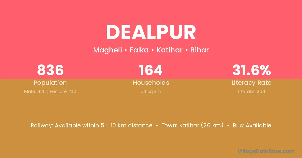 Katihar (26 km) is the nearest town to Dealpur village for major economic activities and is located approximately 26 km away.
