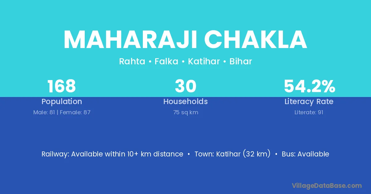 Katihar (32 km) is the nearest town to Maharaji Chakla village for major economic activities and is located approximately 32 km away.