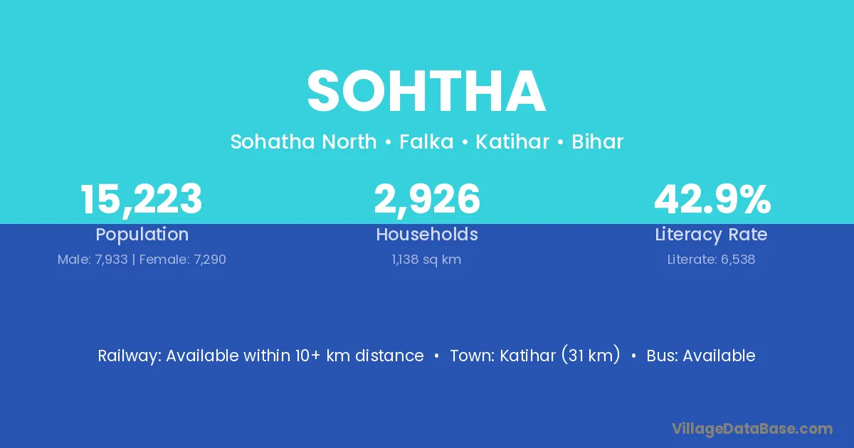 Katihar (31 km) is the nearest town to Sohtha village for major economic activities and is located approximately 31 km away.