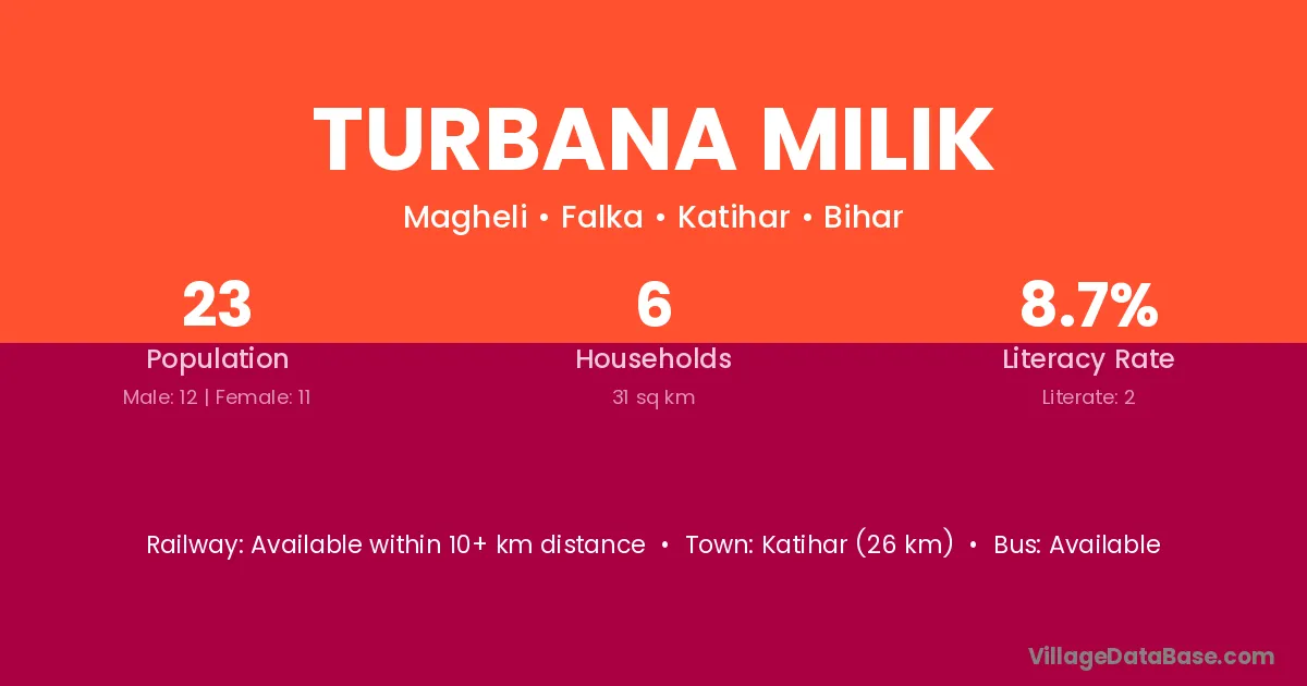 Katihar (26 km) is the nearest town to Turbana Milik village for major economic activities and is located approximately 26 km away.