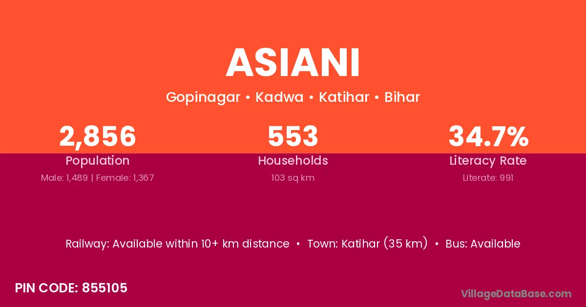 Katihar (35 km) is the nearest town to Asiani village for major economic activities and is located approximately 35 km away.