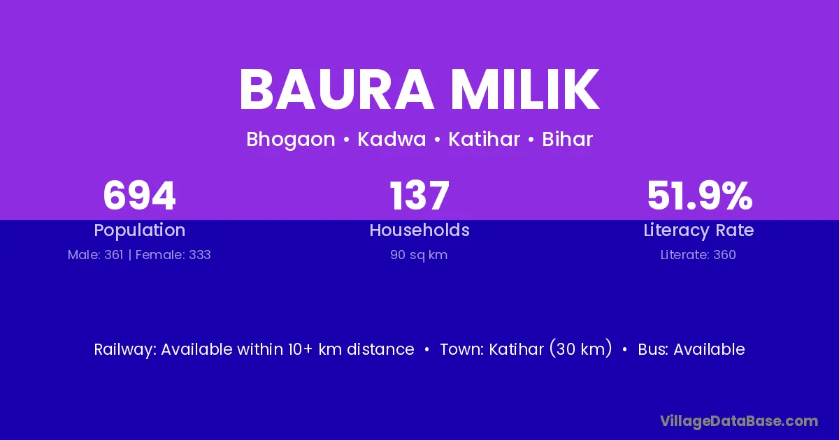 Katihar (30 km) is the nearest town to Baura Milik village for major economic activities and is located approximately 30 km away.