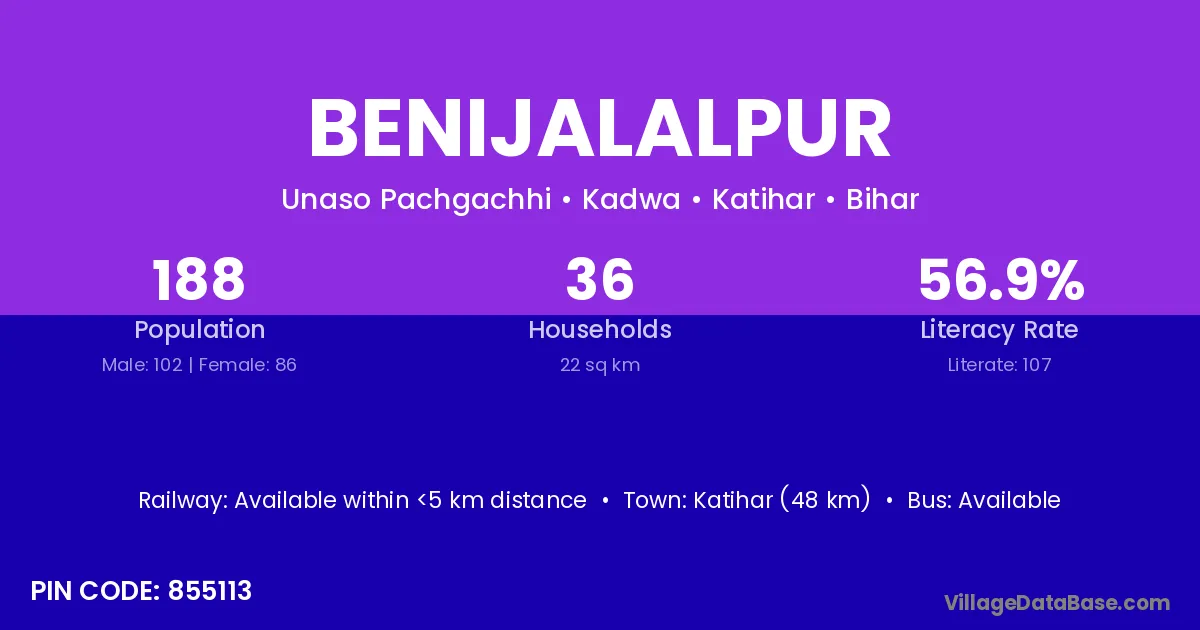 Katihar (48 km) is the nearest town to Benijalalpur village for major economic activities and is located approximately 48 km away.