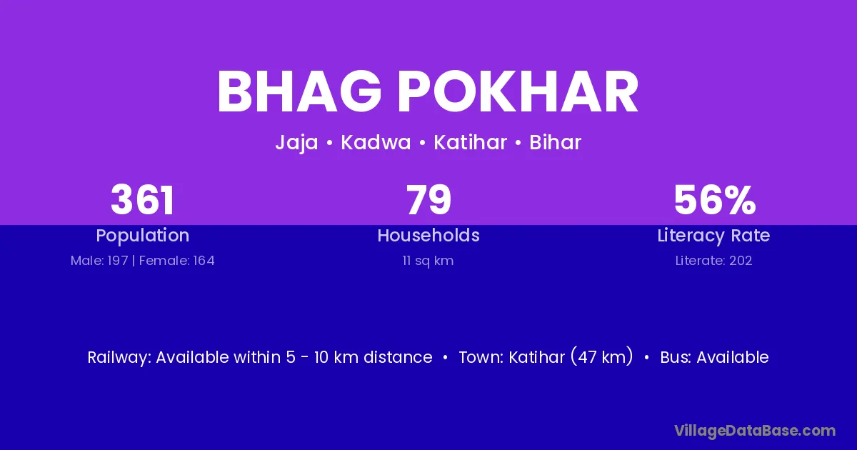 Katihar (47 km) is the nearest town to Bhag Pokhar village for major economic activities and is located approximately 47 km away.
