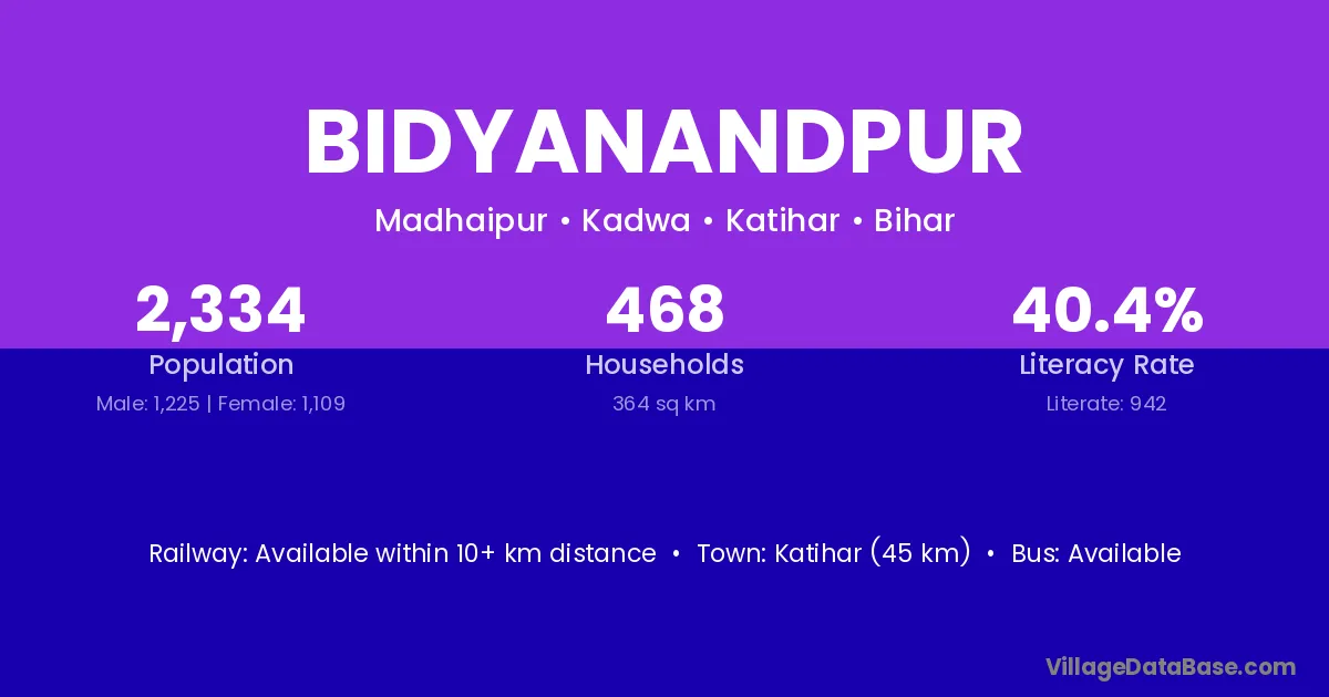 Katihar (45 km) is the nearest town to Bidyanandpur village for major economic activities and is located approximately 45 km away.
