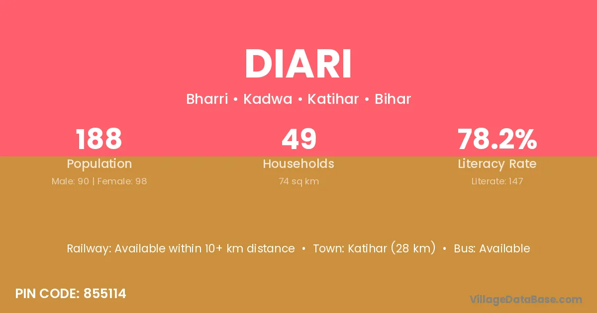 Katihar (28 km) is the nearest town to Diari village for major economic activities and is located approximately 28 km away.
