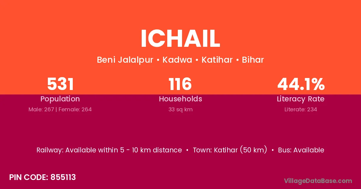 Katihar (50 km) is the nearest town to Ichail village for major economic activities and is located approximately 50 km away.