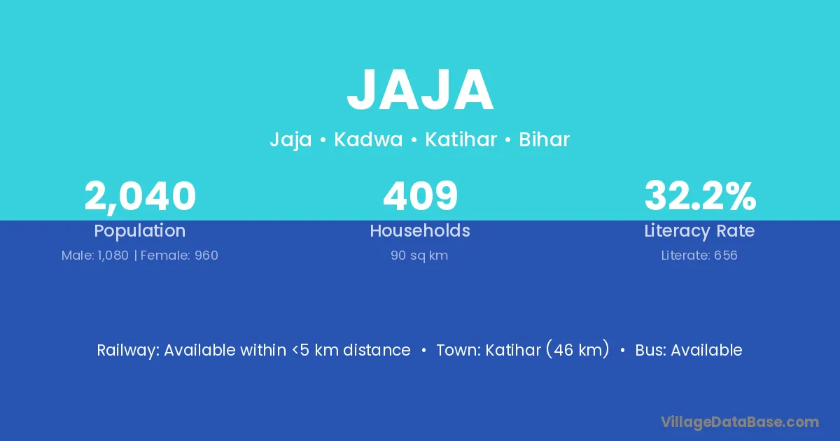 Katihar (46 km) is the nearest town to Jaja village for major economic activities and is located approximately 46 km away.