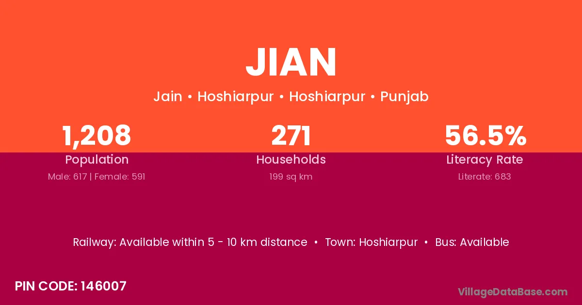 The literacy rate of Jian village is 26.95%. Male literacy stands at 33.49% and female literacy at 19.30%.
