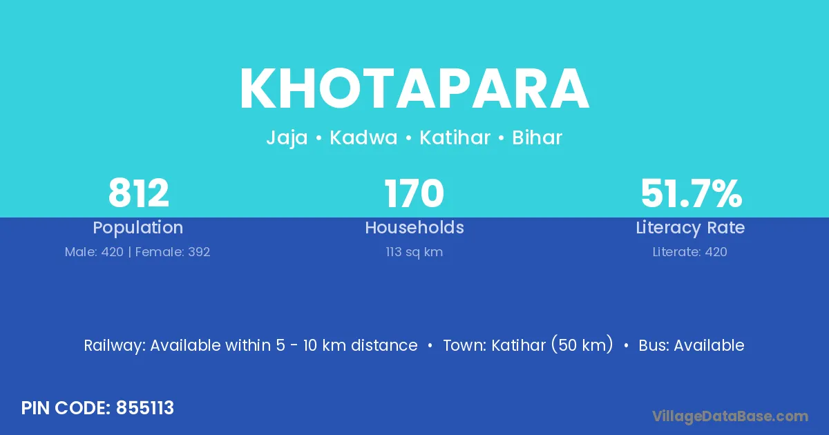 Katihar (50 km) is the nearest town to Khotapara village for major economic activities and is located approximately 50 km away.