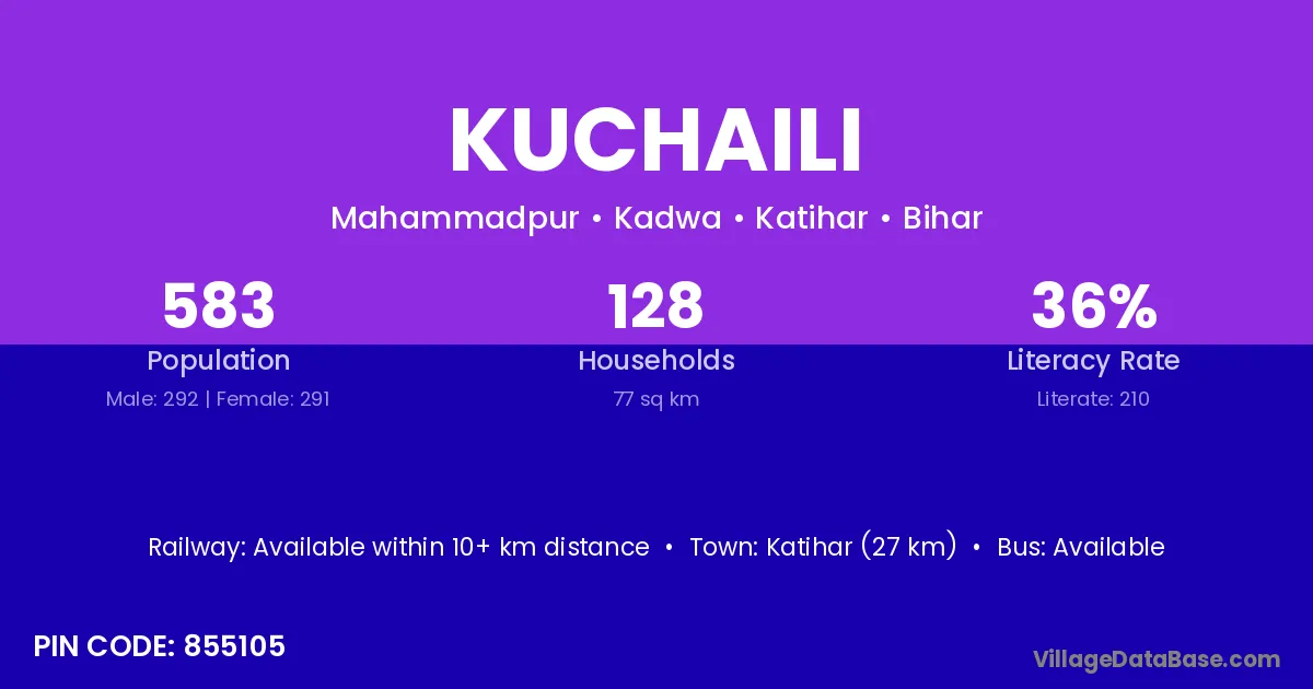 Katihar (27 km) is the nearest town to Kuchaili village for major economic activities and is located approximately 27 km away.