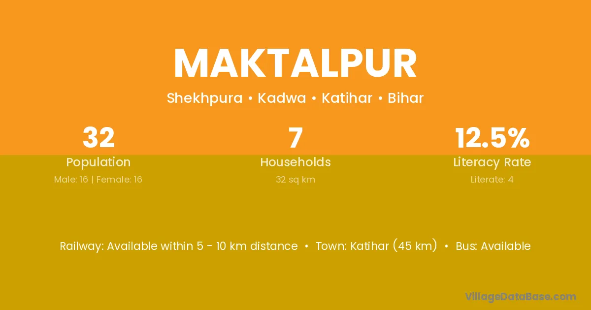 Katihar (45 km) is the nearest town to Maktalpur village for major economic activities and is located approximately 45 km away.