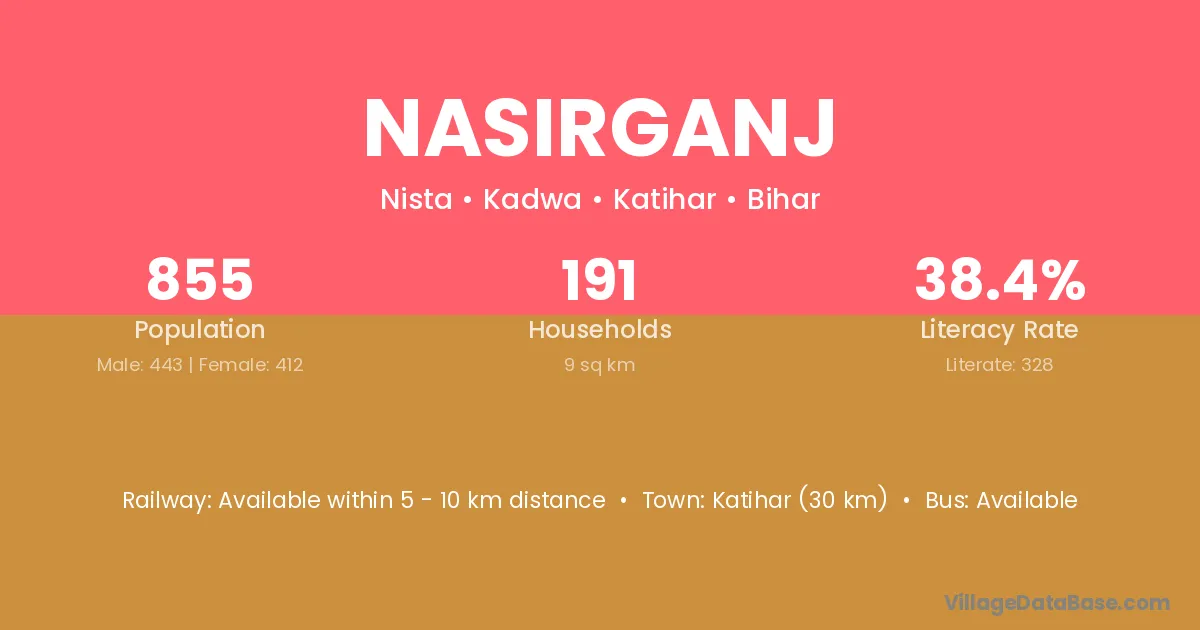 Katihar (30 km) is the nearest town to Nasirganj village for major economic activities and is located approximately 30 km away.
