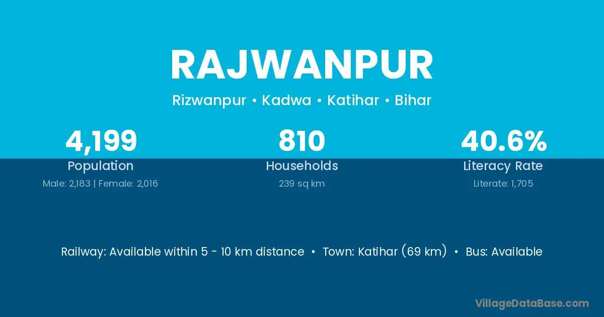 Katihar (69 km) is the nearest town to Rajwanpur village for major economic activities and is located approximately 69 km away.