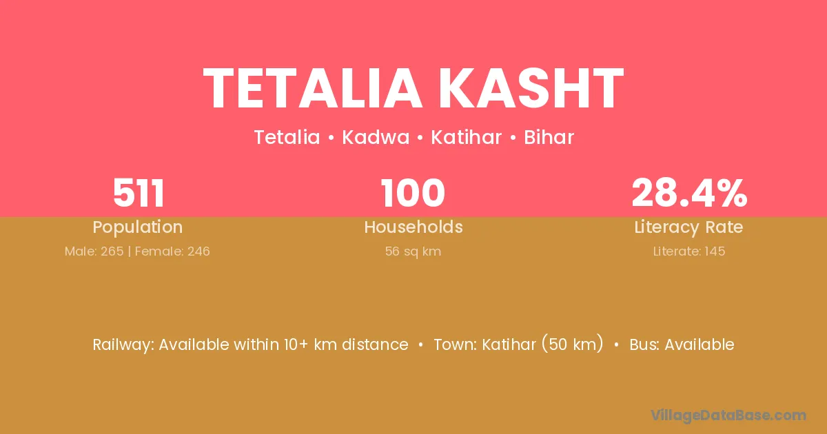 Katihar (50 km) is the nearest town to Tetalia Kasht village for major economic activities and is located approximately 50 km away.