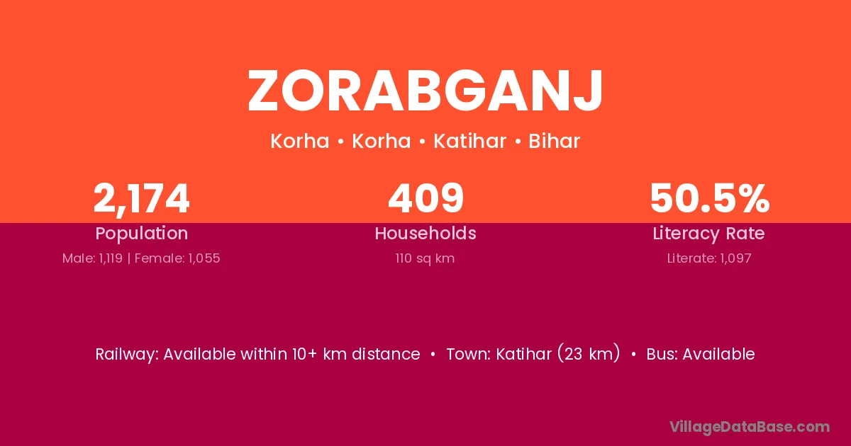 Katihar (23 km) is the nearest town to Zorabganj village for major economic activities and is located approximately 23 km away.