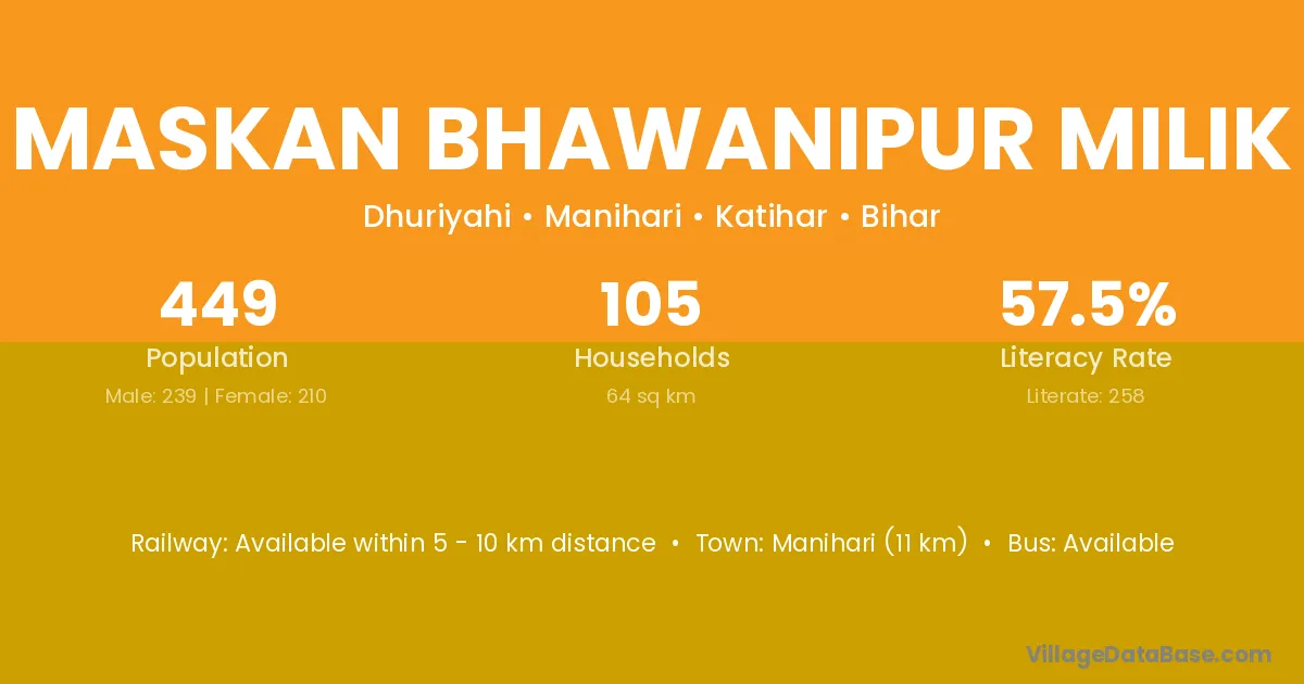 Manihari (11 km) is the nearest town to Maskan Bhawanipur Milik village for major economic activities and is located approximately 11 km away.