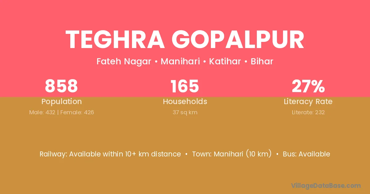 Manihari (10 km) is the nearest town to Teghra Gopalpur village for major economic activities and is located approximately 10 km away.