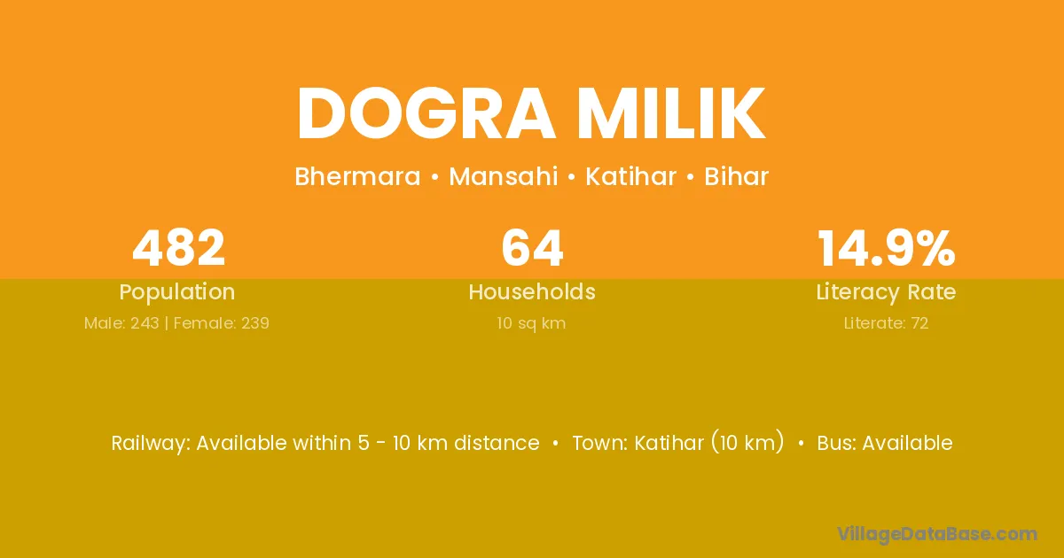 Katihar (10 km) is the nearest town to Dogra Milik village for major economic activities and is located approximately 10 km away.