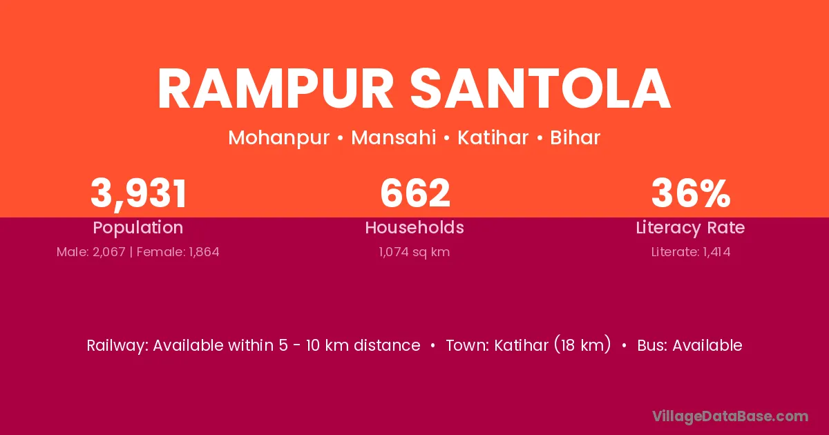 Katihar (18 km) is the nearest town to Rampur Santola village for major economic activities and is located approximately 18 km away.