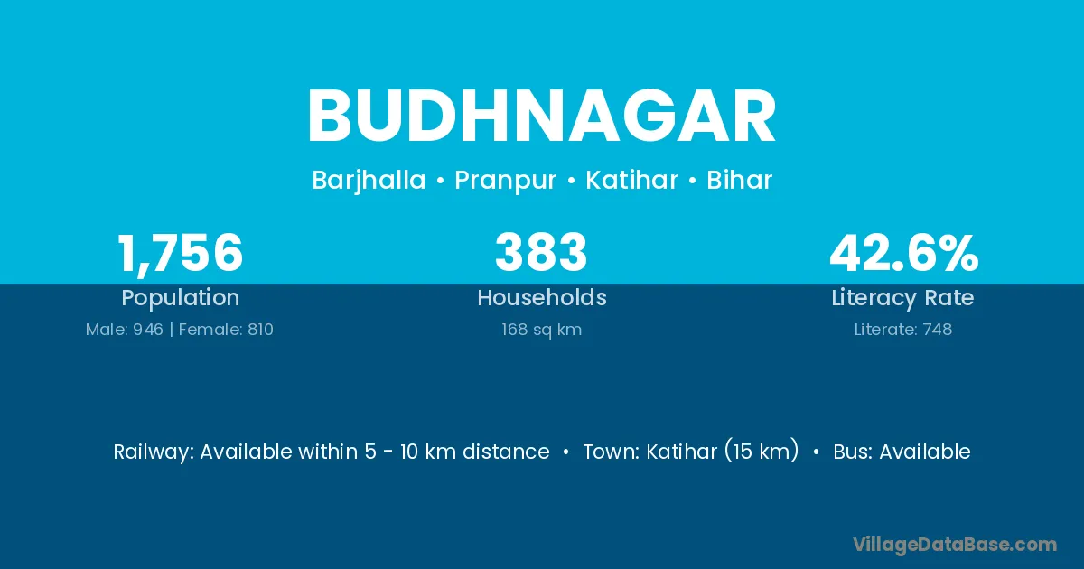 Katihar (15 km) is the nearest town to Budhnagar village for major economic activities and is located approximately 15 km away.