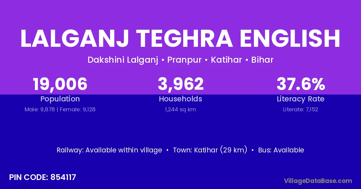 Katihar (29 km) is the nearest town to Lalganj Teghra English village for major economic activities and is located approximately 29 km away.