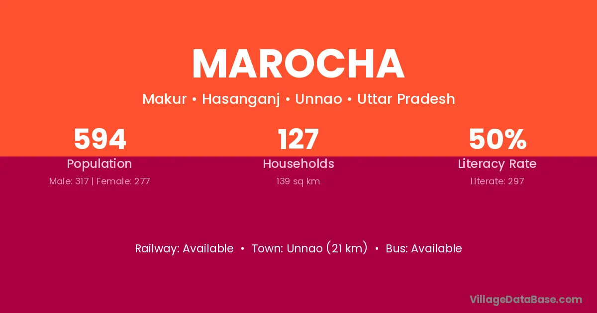 The literacy rate of Marocha village is 41.36%. Male literacy stands at 46.77% and female literacy at 35.36%.