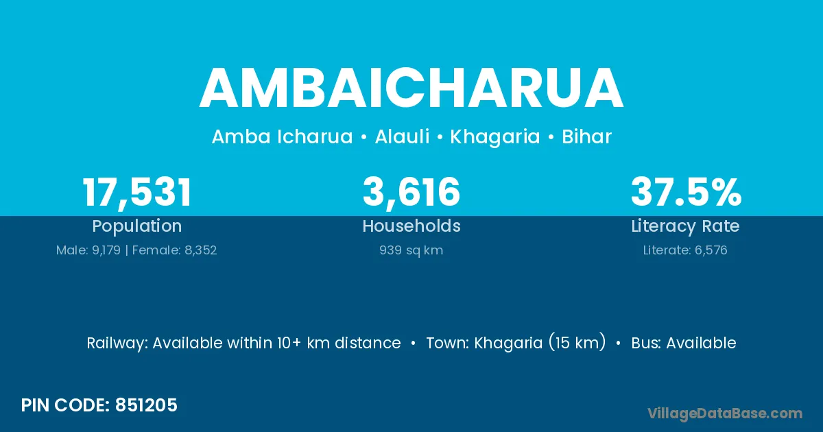 Khagaria (15 km) is the nearest town to Ambaicharua village for major economic activities and is located approximately 15 km away.