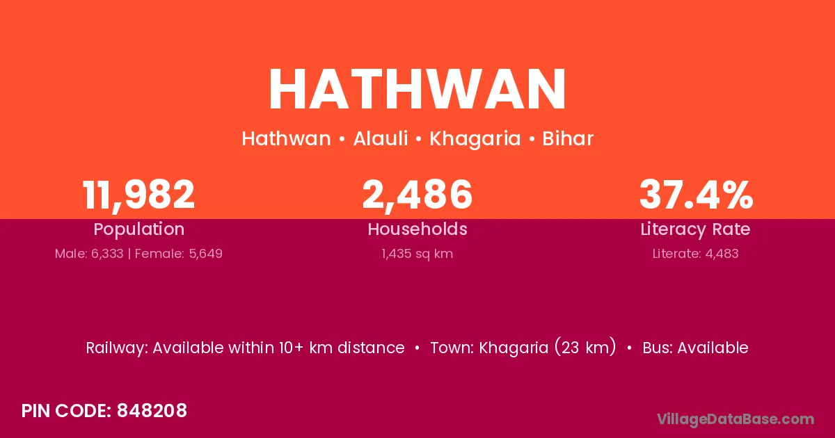 Khagaria (23 km) is the nearest town to Hathwan village for major economic activities and is located approximately 23 km away.