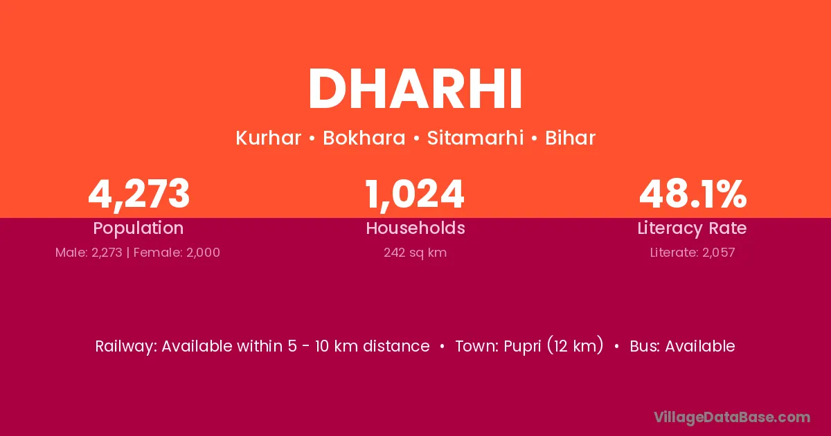 Khagaria (45 km) is the nearest town to Dharhi village for major economic activities and is located approximately 45 km away.