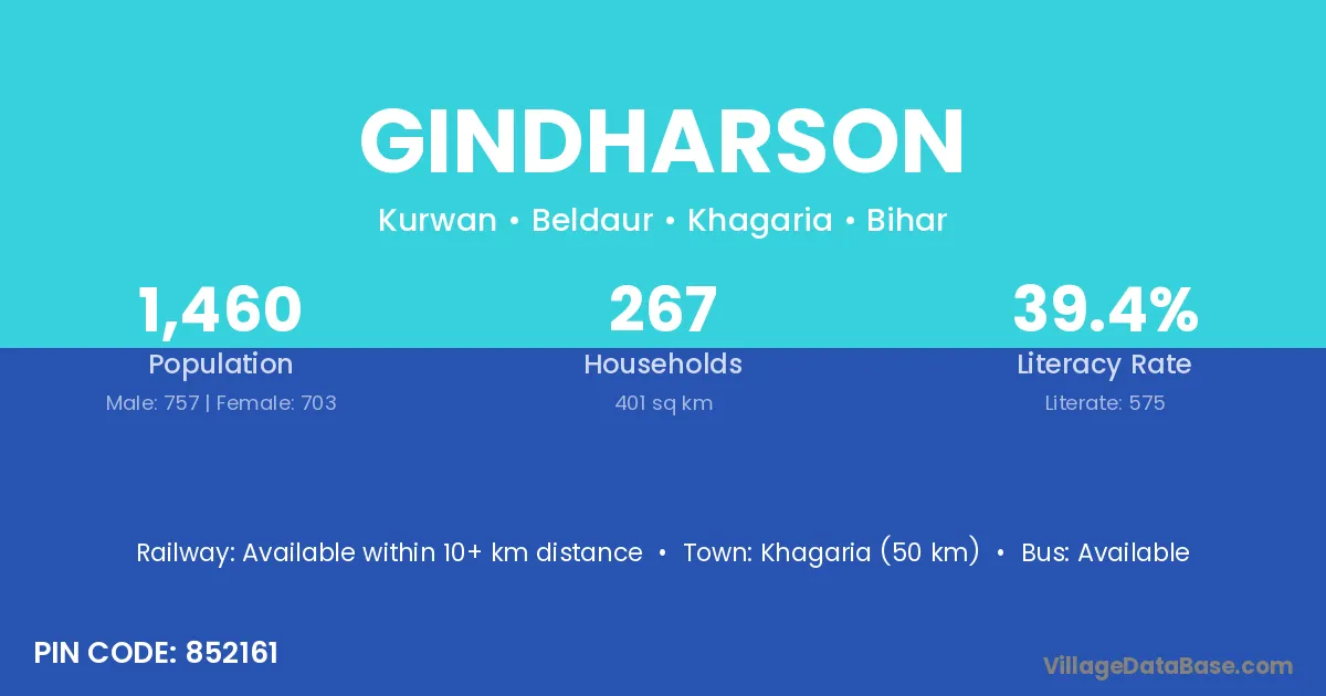Khagaria (50 km) is the nearest town to Gindharson village for major economic activities and is located approximately 50 km away.