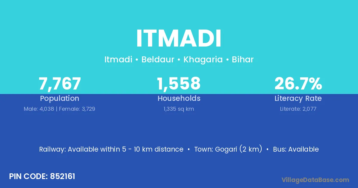 Gogari (2 km) is the nearest town to Itmadi village for major economic activities and is located approximately 2 km away.