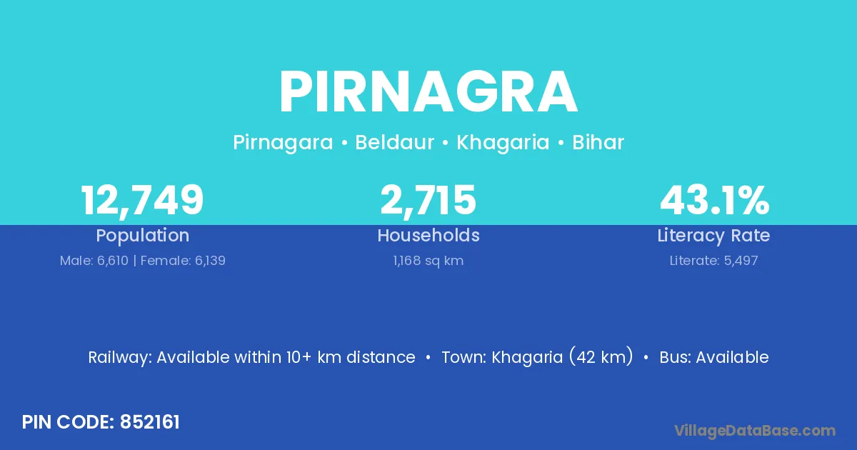 Khagaria (42 km) is the nearest town to Pirnagra village for major economic activities and is located approximately 42 km away.
