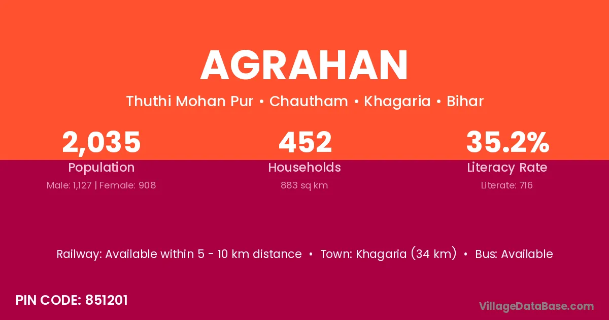 Khagaria (34 km) is the nearest town to Agrahan village for major economic activities and is located approximately 34 km away.