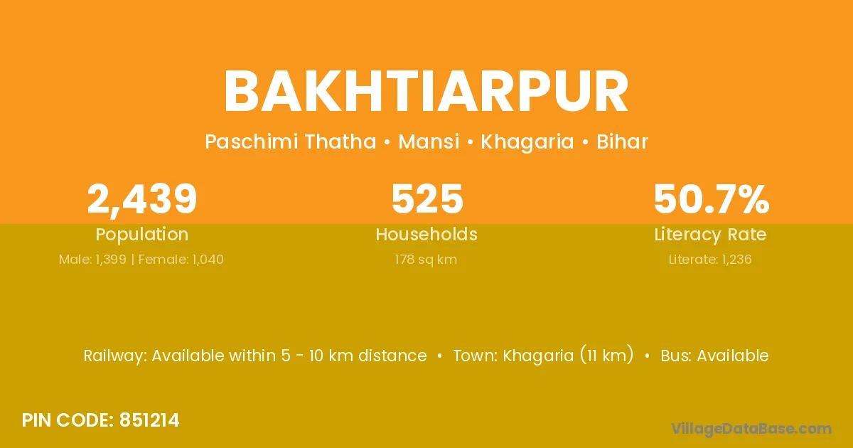 Khagaria (11 km) is the nearest town to Bakhtiarpur village for major economic activities and is located approximately 11 km away.