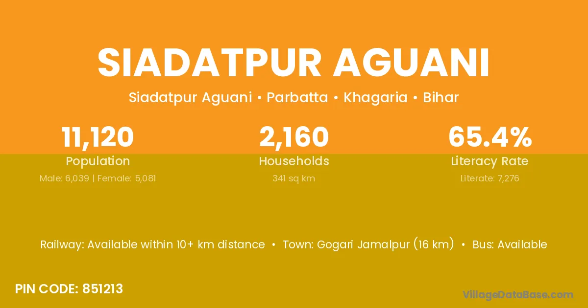 Siadatpur Aguani village has a total population of 11,120 people, of which 6,039 are males and 5,081 are females.