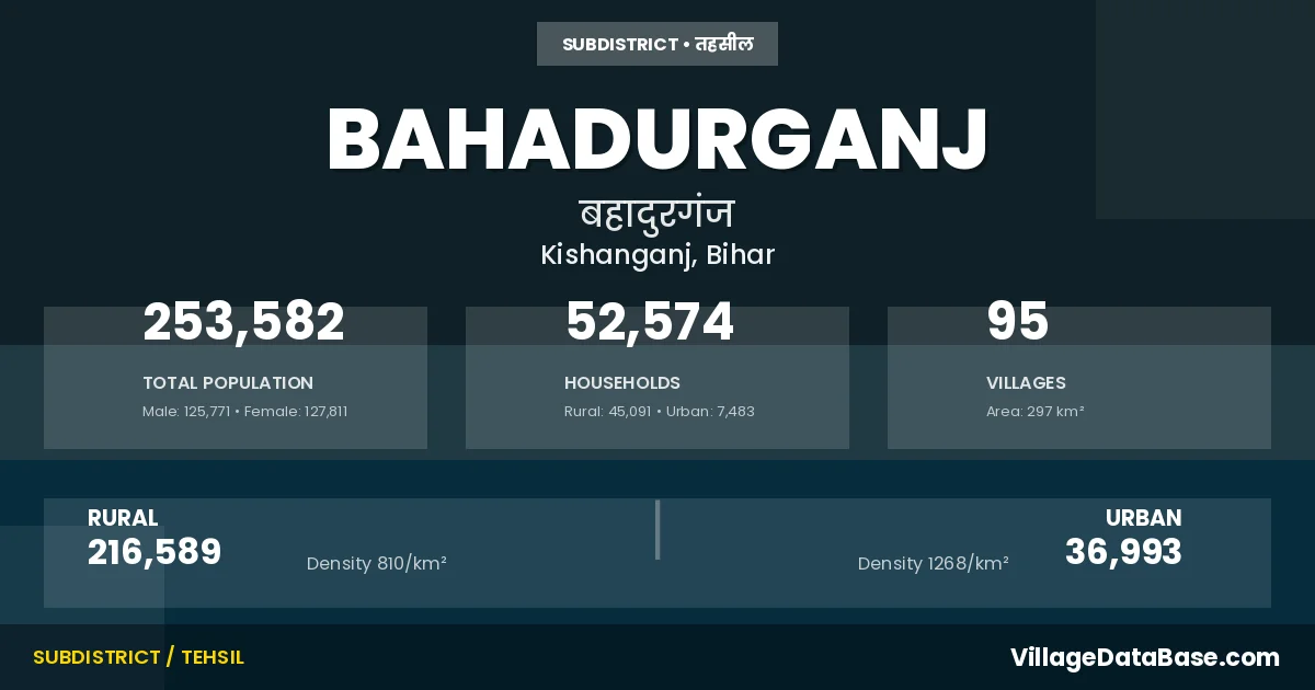 According to the 2011 census The total area of Bahadurganj Subdivision is 297 km², with a population of 253582 people. The population density is 855 inhabitants per square kilometre, and there are approximately 52574 houses in the sub district.