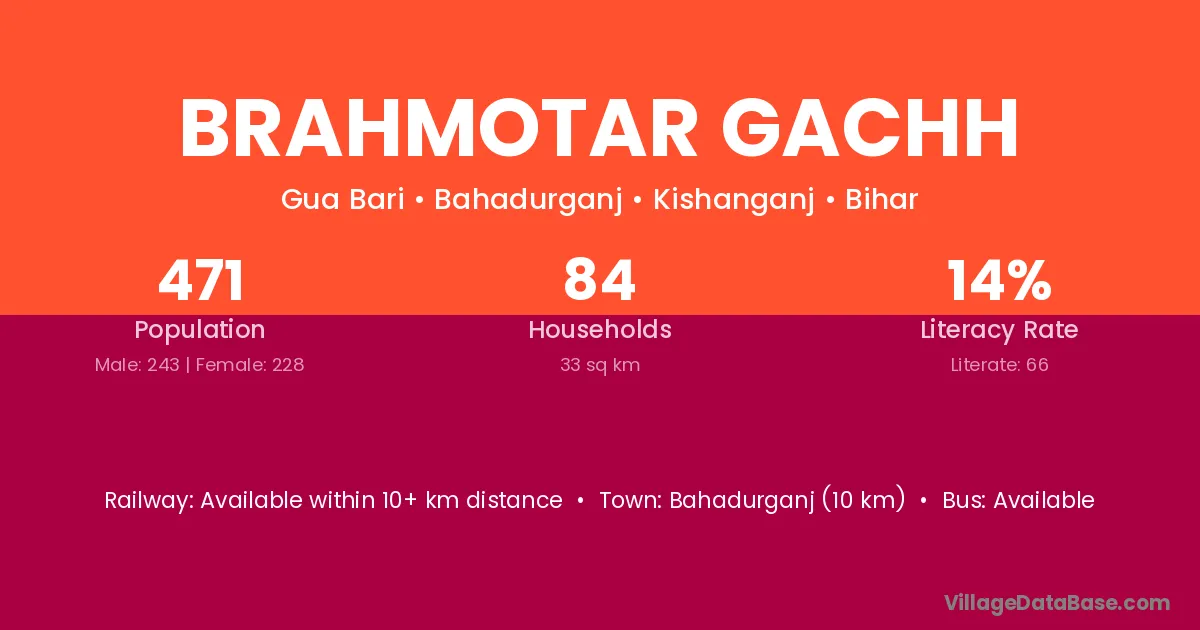 Brahmotar Gachh village has a total population of 471 people, of which 243 are males and 228 are females.