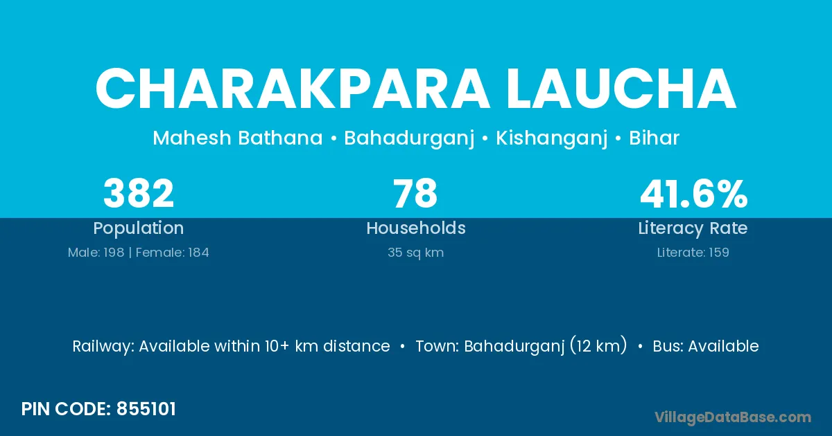 Bahadurganj (12 km) is the nearest town to Charakpara Laucha village for major economic activities and is located approximately 12 km away.