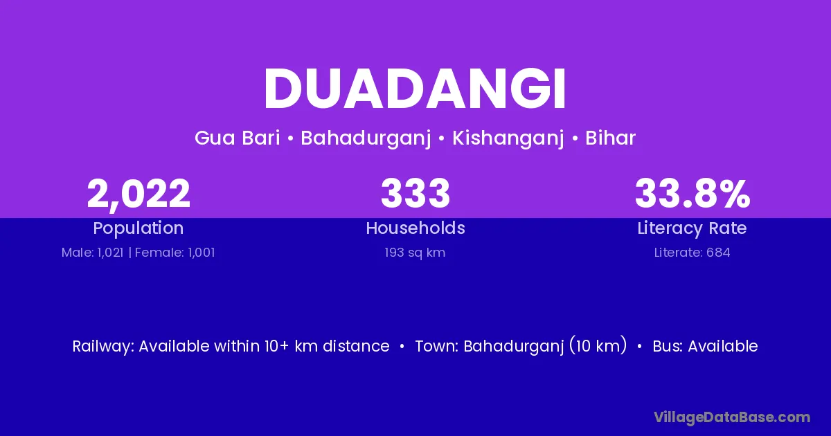 Bahadurganj (10 km) is the nearest town to Duadangi village for major economic activities and is located approximately 10 km away.
