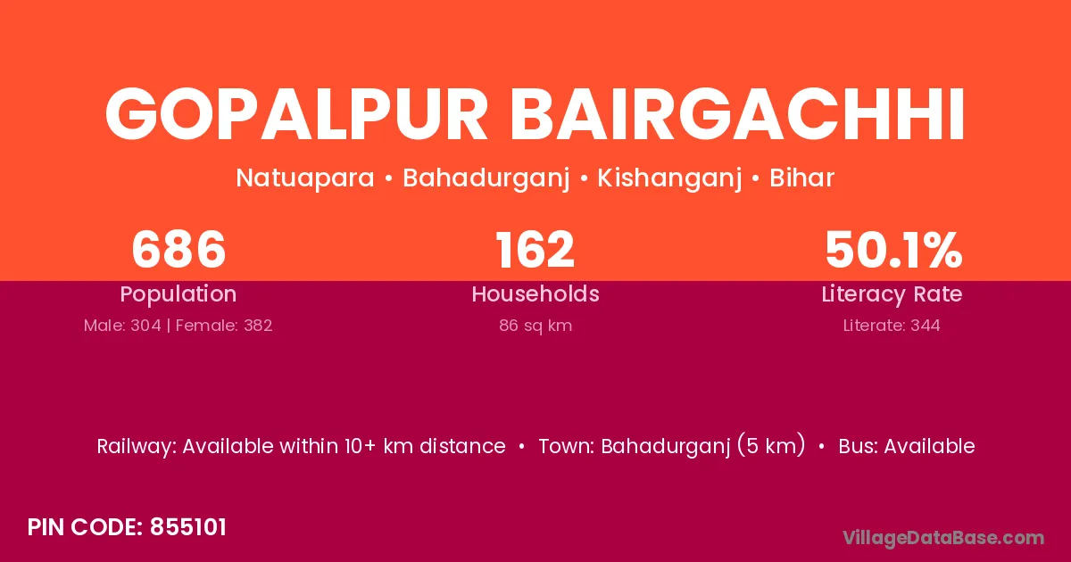 Bahadurganj (5 km) is the nearest town to Gopalpur Bairgachhi village for major economic activities and is located approximately 5 km away.