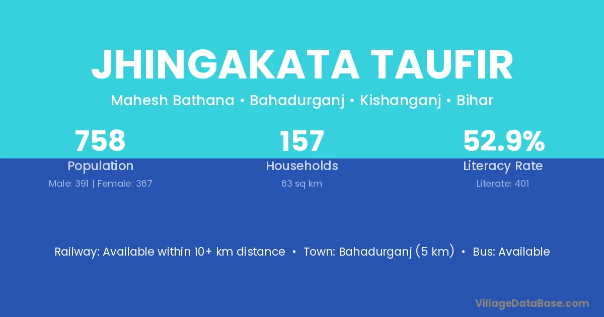 Bahadurganj (5 km) is the nearest town to Jhingakata Taufir village for major economic activities and is located approximately 5 km away.