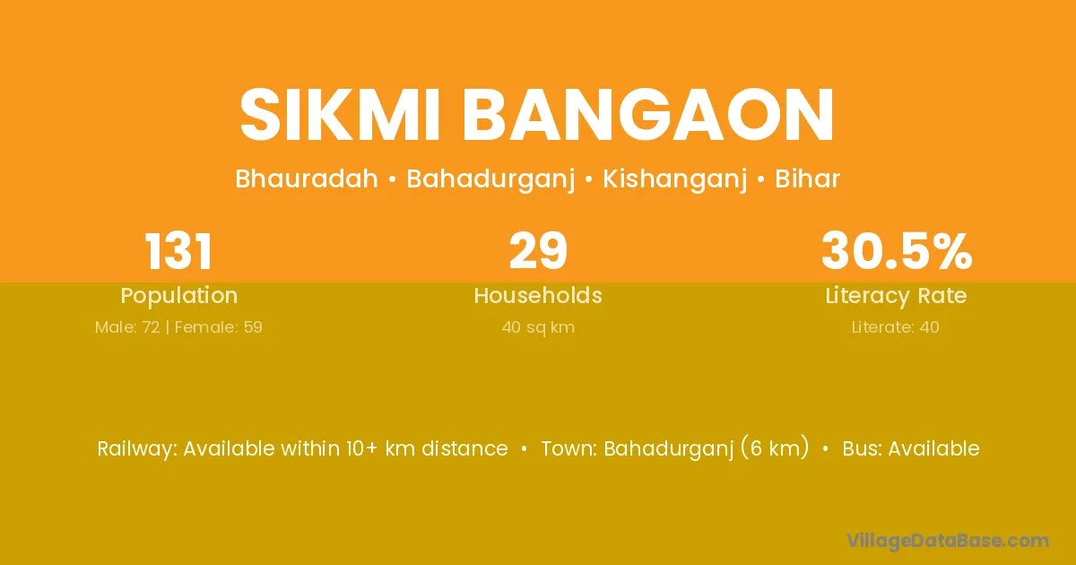 Sikmi Bangaon village has a total population of 131 people, of which 72 are males and 59 are females.