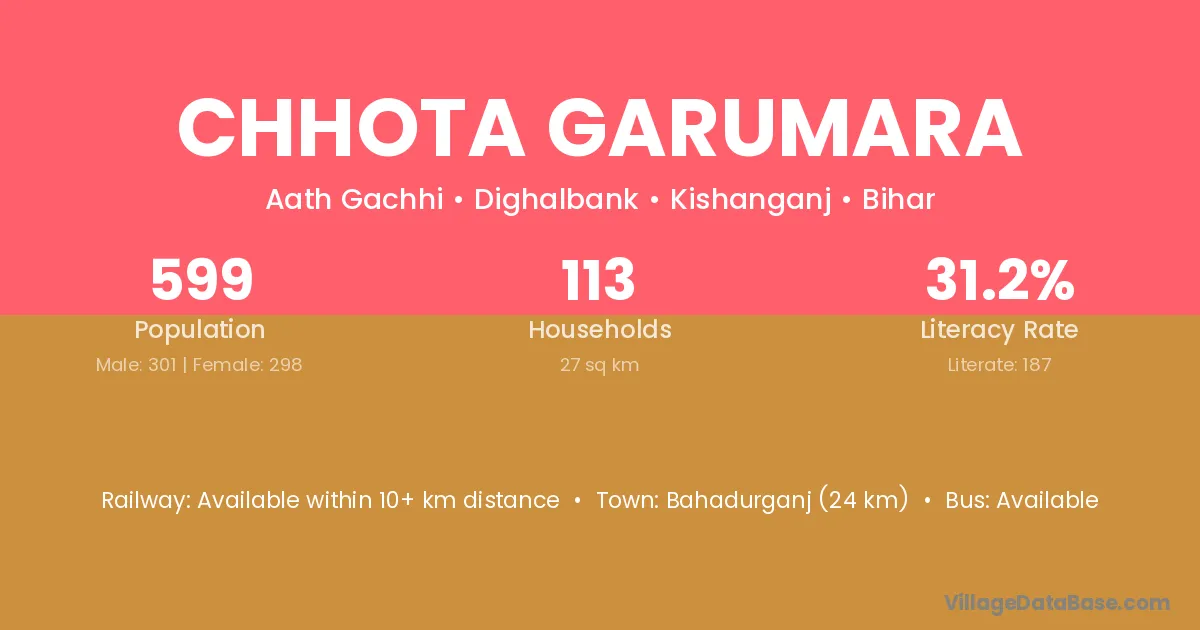 Chhota Garumara village has a total population of 599 people, of which 301 are males and 298 are females.