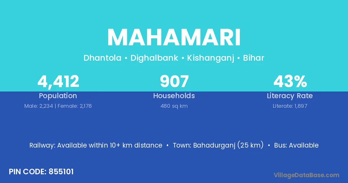 Bahadurganj (25 km) is the nearest town to Mahamari village for major economic activities and is located approximately 25 km away.