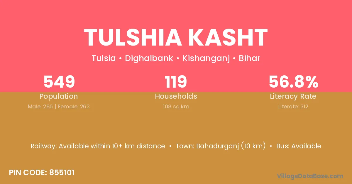 Bahadurganj (10 km) is the nearest town to Tulshia Kasht village for major economic activities and is located approximately 10 km away.