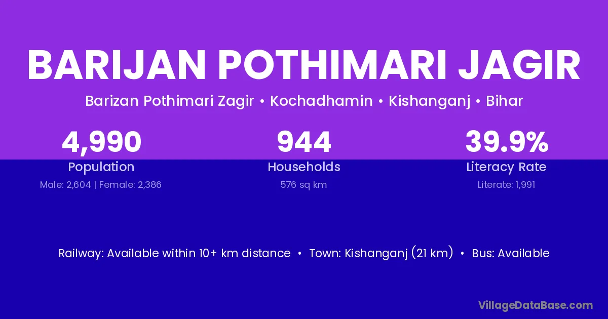 Kishanganj (21 km) is the nearest town to Barijan Pothimari Jagir village for major economic activities and is located approximately 21 km away.