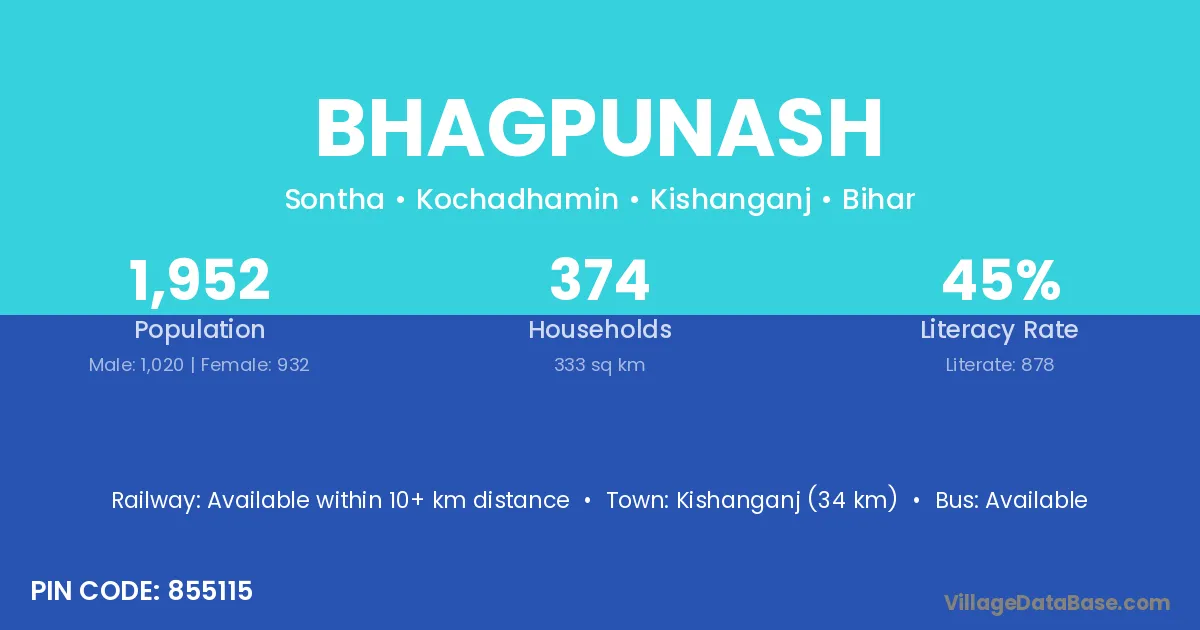 Kishanganj (34 km) is the nearest town to Bhagpunash village for major economic activities and is located approximately 34 km away.